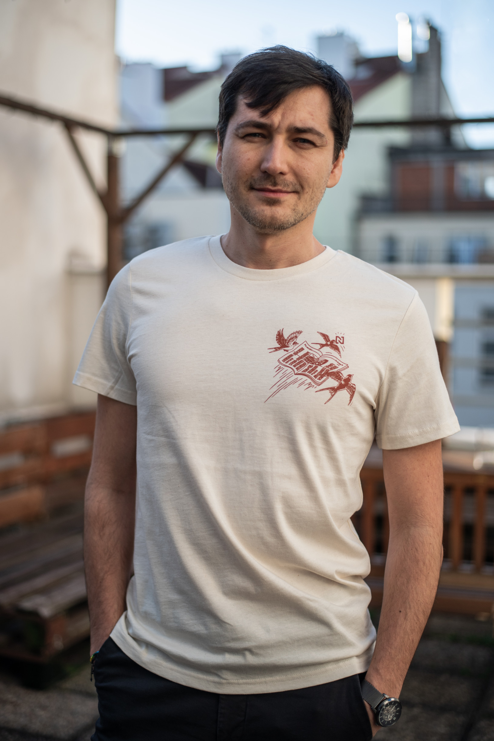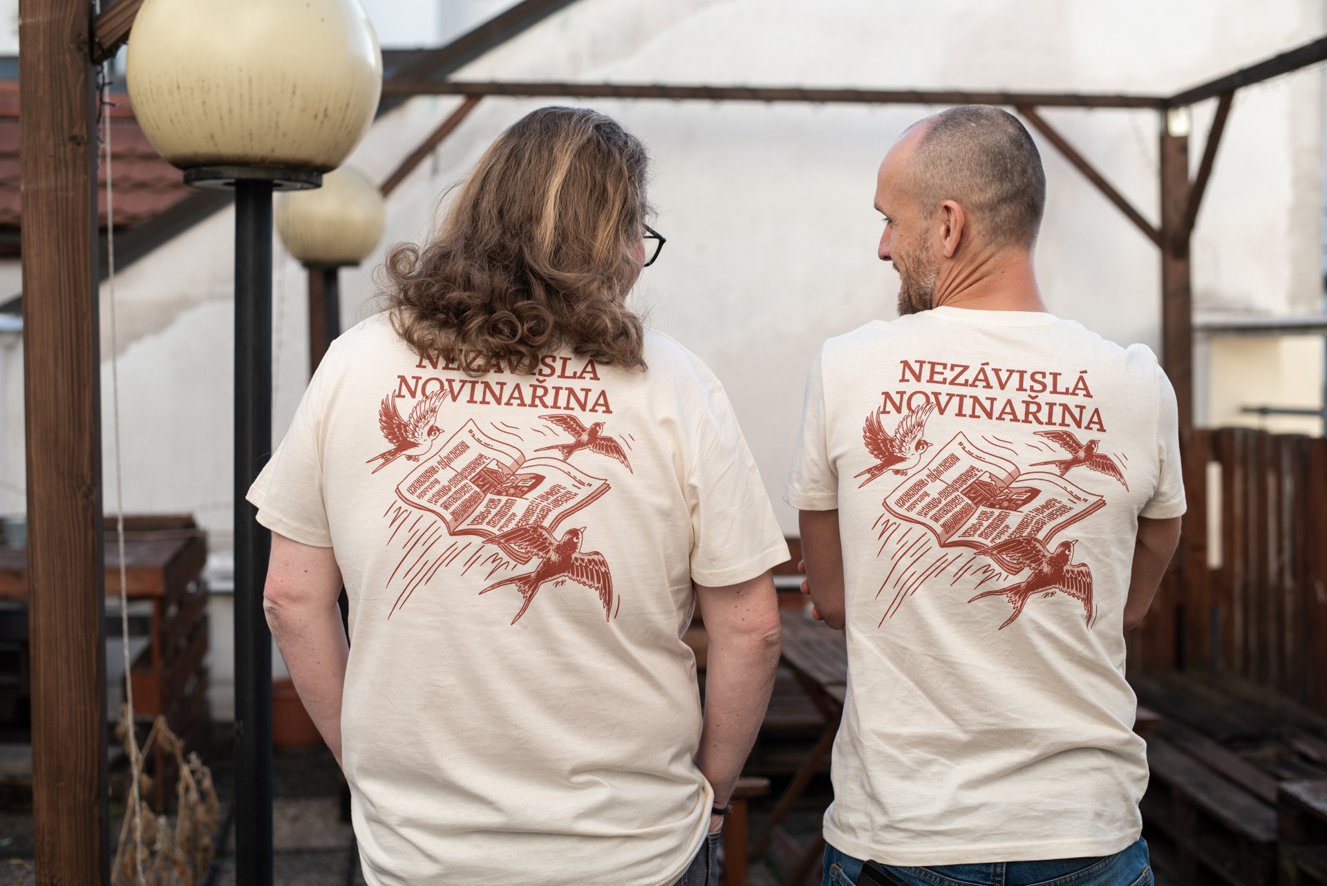 Unisex tričko v přírodním odstínu s ilustrací Nezávislá novinařina od Petra Poláka.